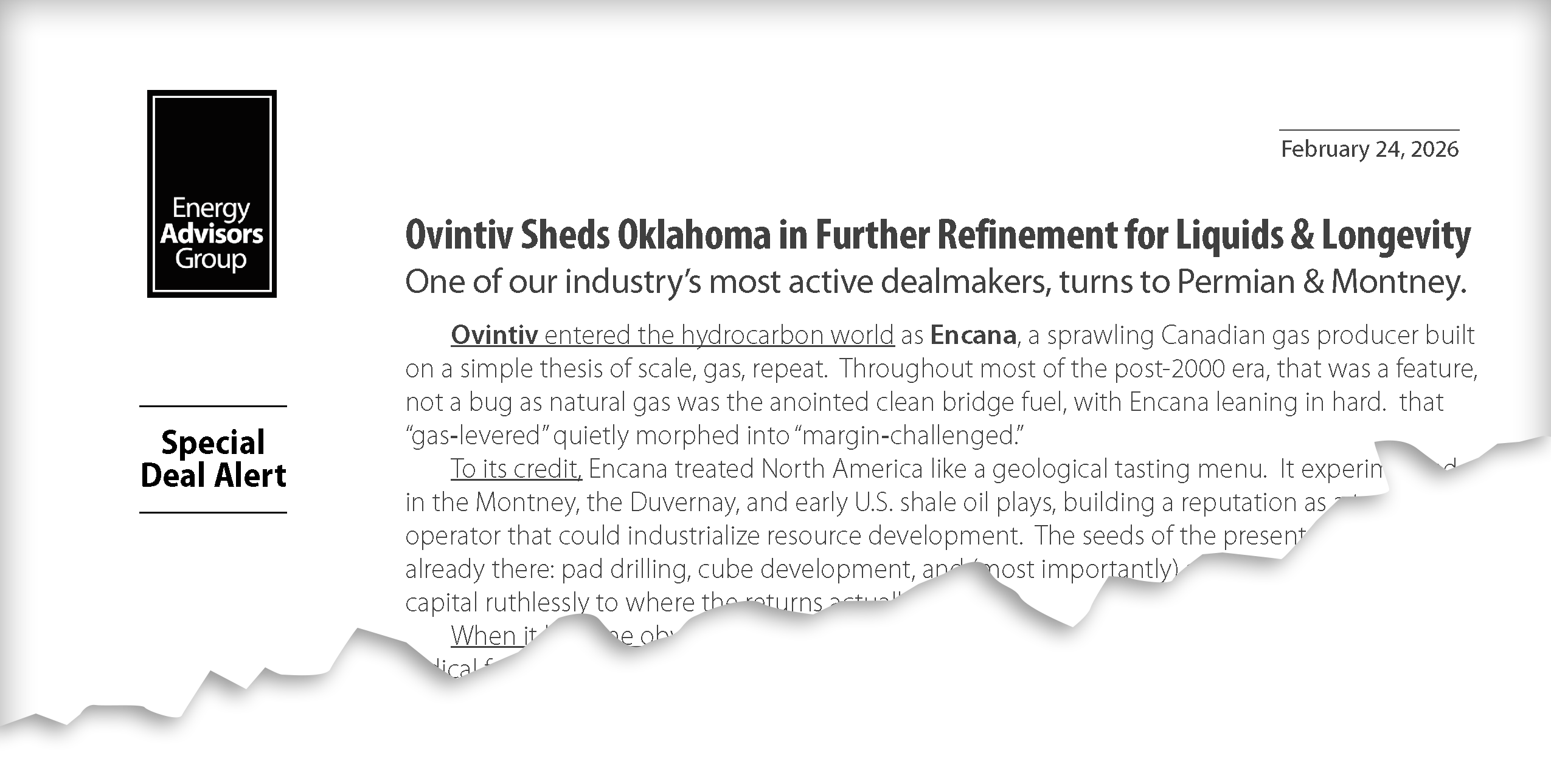 Energy Advisors issued a Deal Alert, Ovintiv Sheds Oklahoma in Further Refinement for Liquids & Longevity, analyzing one of our industry's most active dealmakers transformation to Permian + Montney.
